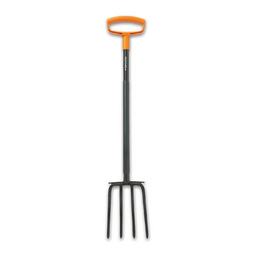 The Fiskars garden fork is an ideal tool for working through soil prior to planting or harvesting. The garden fork features an all-steel construction for heavy-duty strength and durability. The unit also features an oversized step for additional leverage and comfort, and the fork blades are pre-sharpened to easily cut through a variety of different soils. The teardrop-shaped shaft and oversized d-handle provide ergonomic comfort and control during use. For added strength, the tines themselves are directly welded onto the shaft, and the entire fork is powder-coated to prevent rust. There's also a PVC sleeve on the tool shaft that provides a comfortable hold in both hot and cold weather.