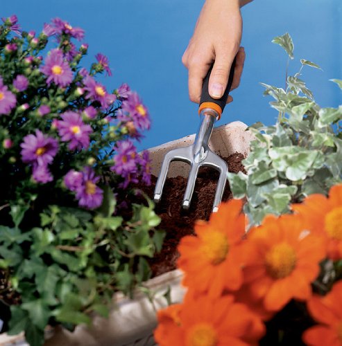 The Fiskars softouch polished aluminum cultivator features a comfortable and sturdy grip molded over a rust-free polished aluminum shaft. The oversized cushion grip is easy to hold, even during extended use, and the one-piece high strength cast aluminum alloy resists bending. The unit's patented grip features a "flat end" that allows the user to push the tool into a variety of different soils easier. The shape also helps maintain a neutral wrist position to reduce fatigue. The tool comes with a hang hole for convenient storage, and a limited lifetime warranty.