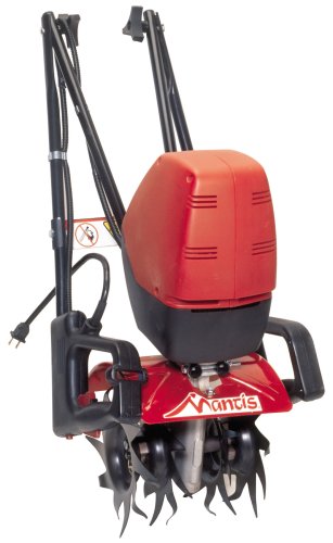 The Mantis 120-volt electric tiller with border edger is a lightweight, 3-speed tiller. It digs down 10 inches and weeds a 30-by-40-foot garden in just 20 minutes. It features one-piece die-cast gearbox and a double-insulated motor. At just 20 pounds in weight, it is easy to start and easy to operate, with the ability to cut through hard sod, compact soil or tangled weeds. Its fold-down handles and compact design make it easy to store. The tiller is backed by a 1-year warranty, and a lifetime warranty covers the tines against breakage.