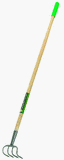 4 tine garden cultivator with enameled head and ferrule. 51" lacquered hardwood handle with green foam end grip. Head width: 4 3 4".