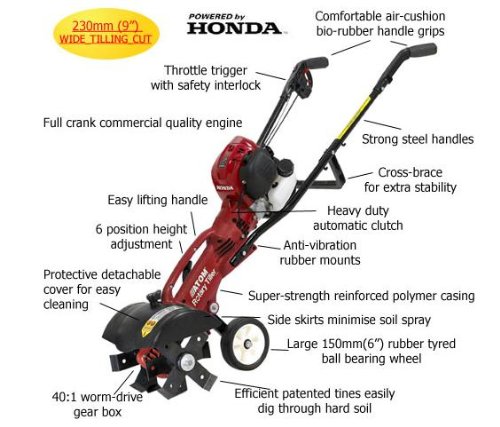 - Smooth tilling action due to patented tine design- Long lasting self sharpening tines last 4 times longer than competitive brands