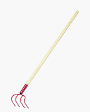 Eagle label. 4 tines, maroon enameled head, 5" wide. Maroon poly ferrule. 48" handle.